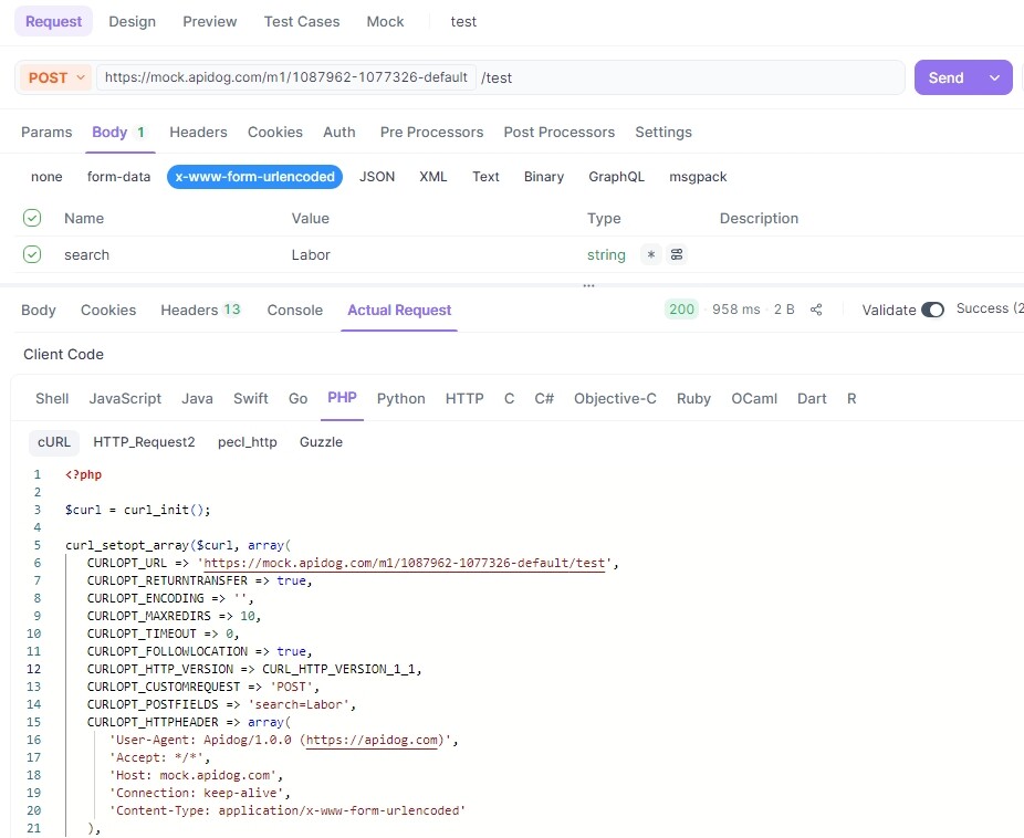 Hello, could you please confirm two things to help us better identify the issue? First, does the Laravel code ( Http::asForm()->post(…) ) come from Actual Request - Client Code? Second, would you mind sharing a screenshot of your endpoint? Additionally, you can compare the data packets of the two requests (the failed one and the successful one) by packet capture. This will help us spot specific differences between them.