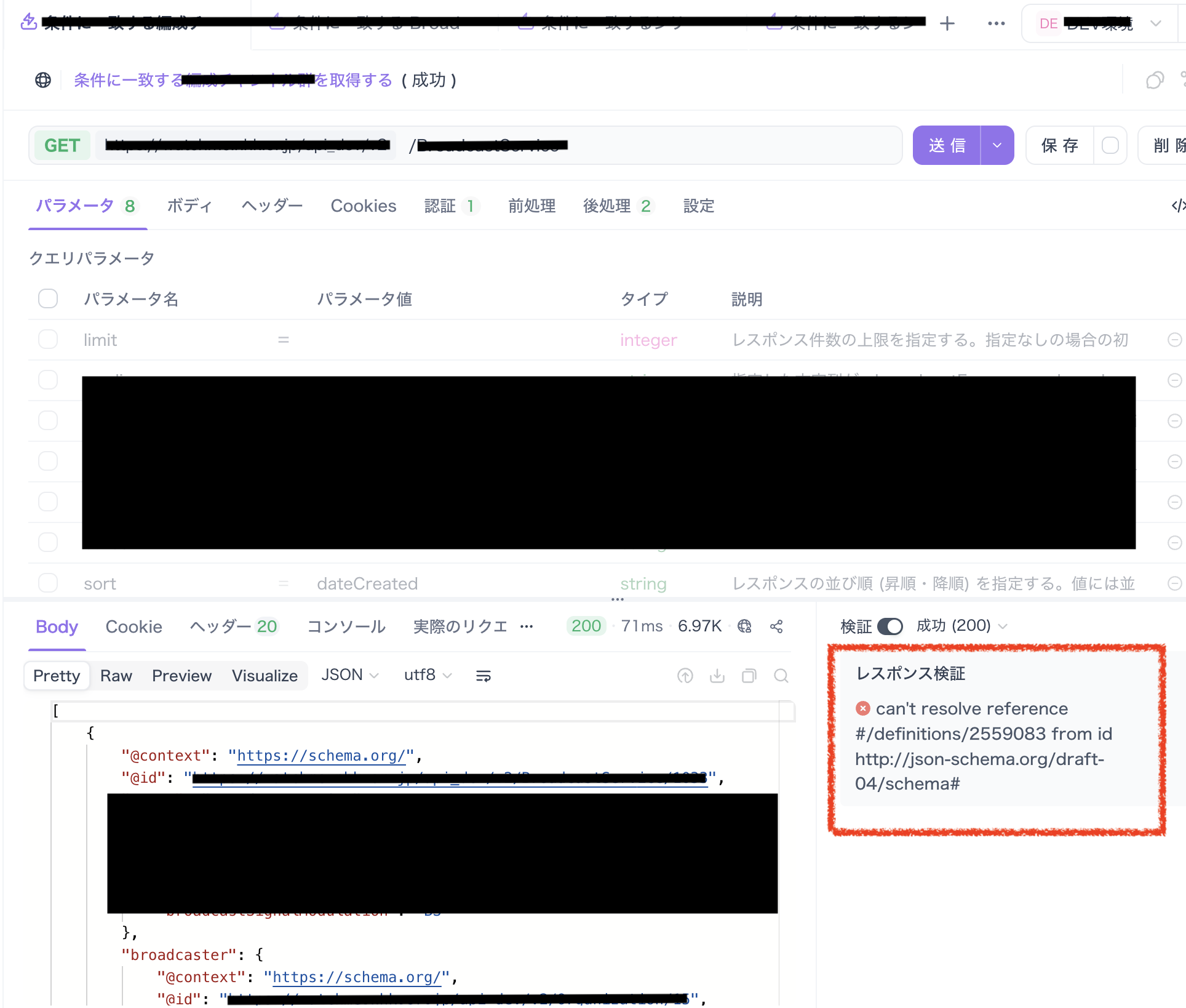 paths → (該当GET) → responses → (失敗しているstatus) → content → application/json → schema 周辺