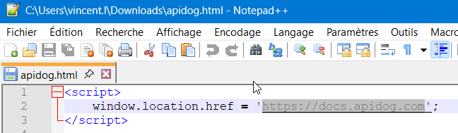 The downloaded file is not the expected ZIP archived, but an HTML file named “apidog.html” with a script that redirects to https://docs.apidog.com
