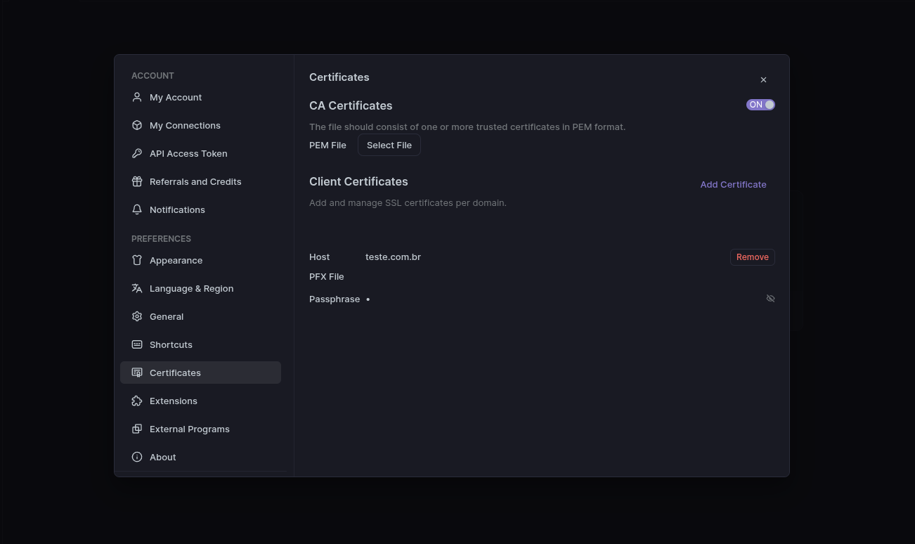 I’m using Google Chrome on Ubuntu Linux and Apidog in the web version + the Apidog Chrome Agent extension. I’m trying to upload my PFX certificate in order to enable SSL on a website.