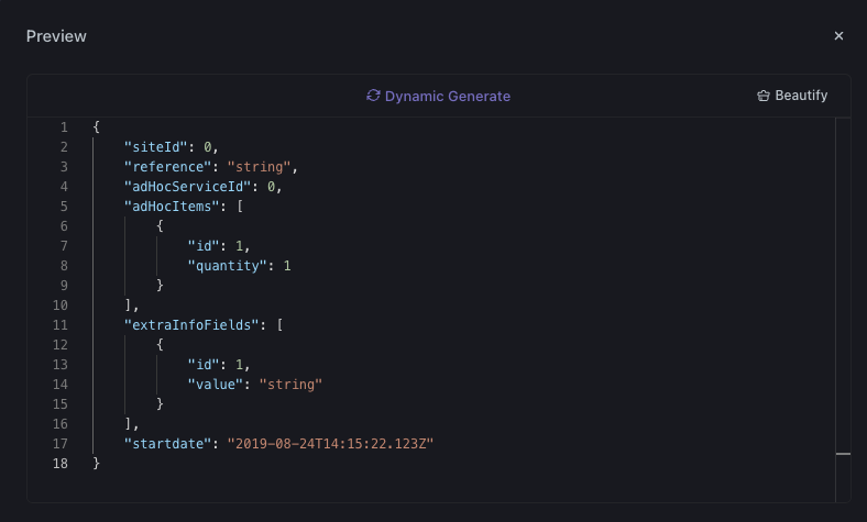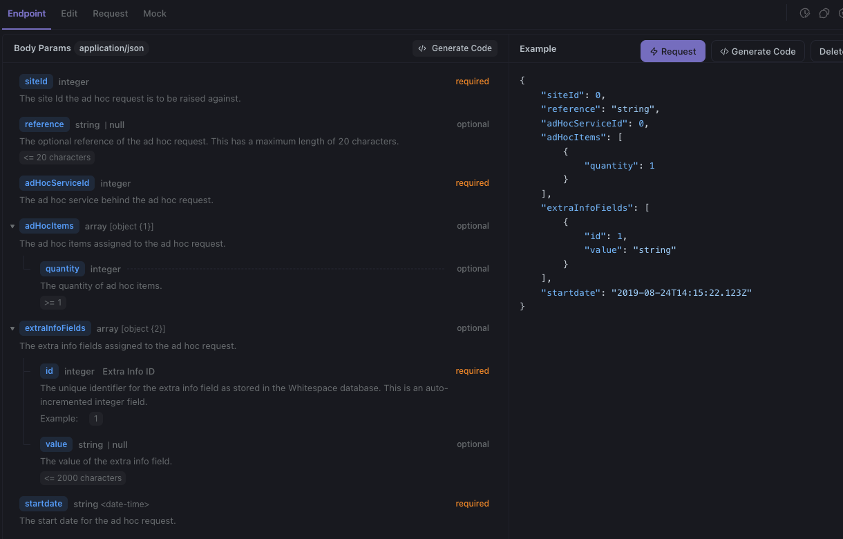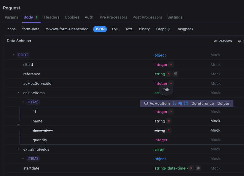 For one of our endpoints we have a referenced schema seen in the screenshot (array of AdHocItem). But when we look at the endpoint the id field is not showing. If I click preview of the request body (screenshot 3 it is there)