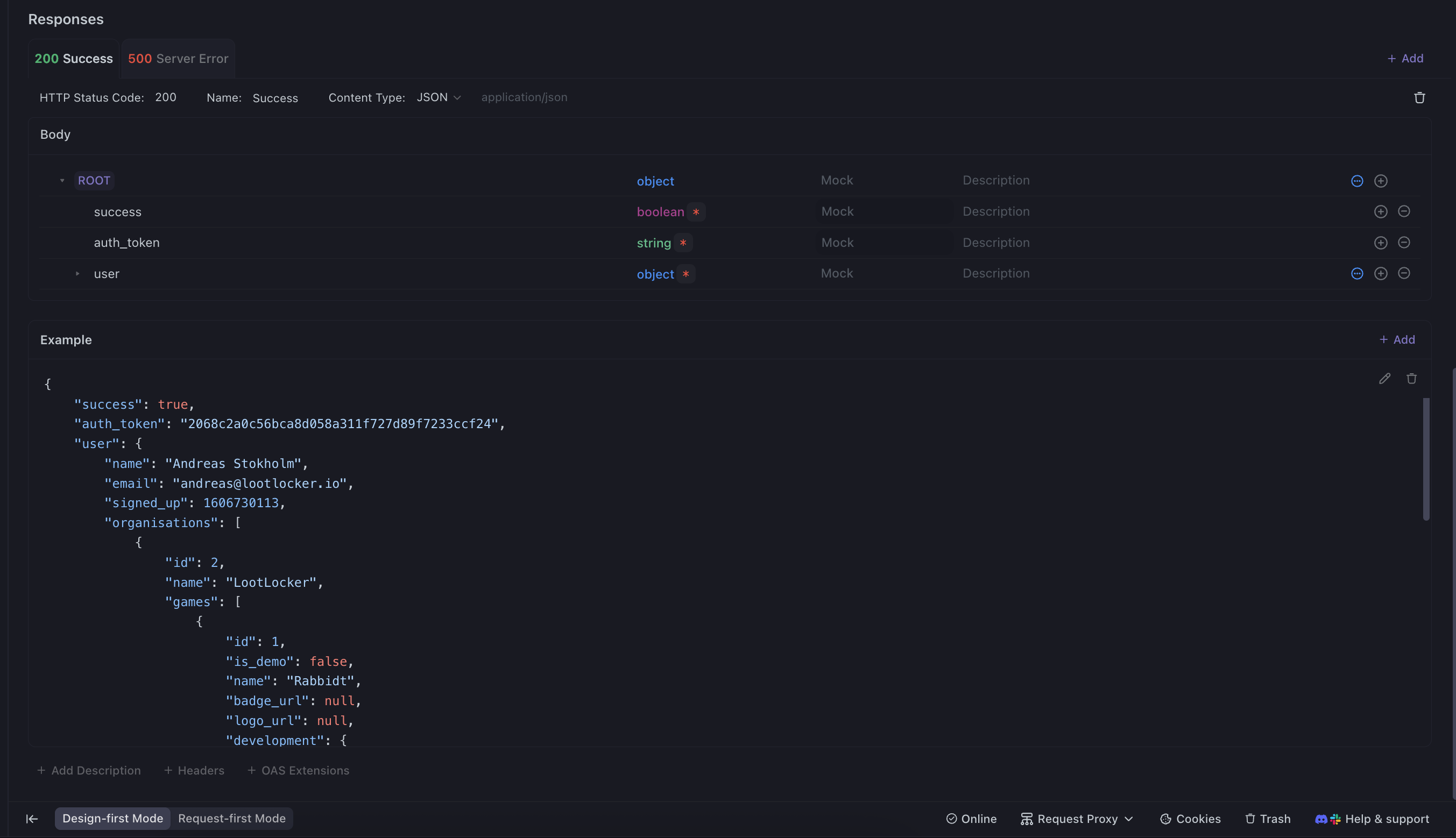 Interesting - this only appears on the duplicated version and not the original, it appears that it’s not quite what I thought it was, duplicating removes the example from the 500 response and moves it to an exception on the success response