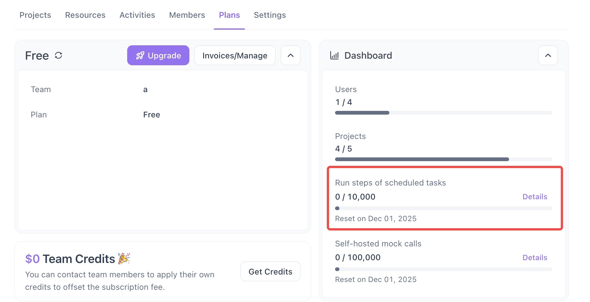 - Since scheduled tasks have usage limits, go to your team’s “Plan” tab to check if you have remaining quota.