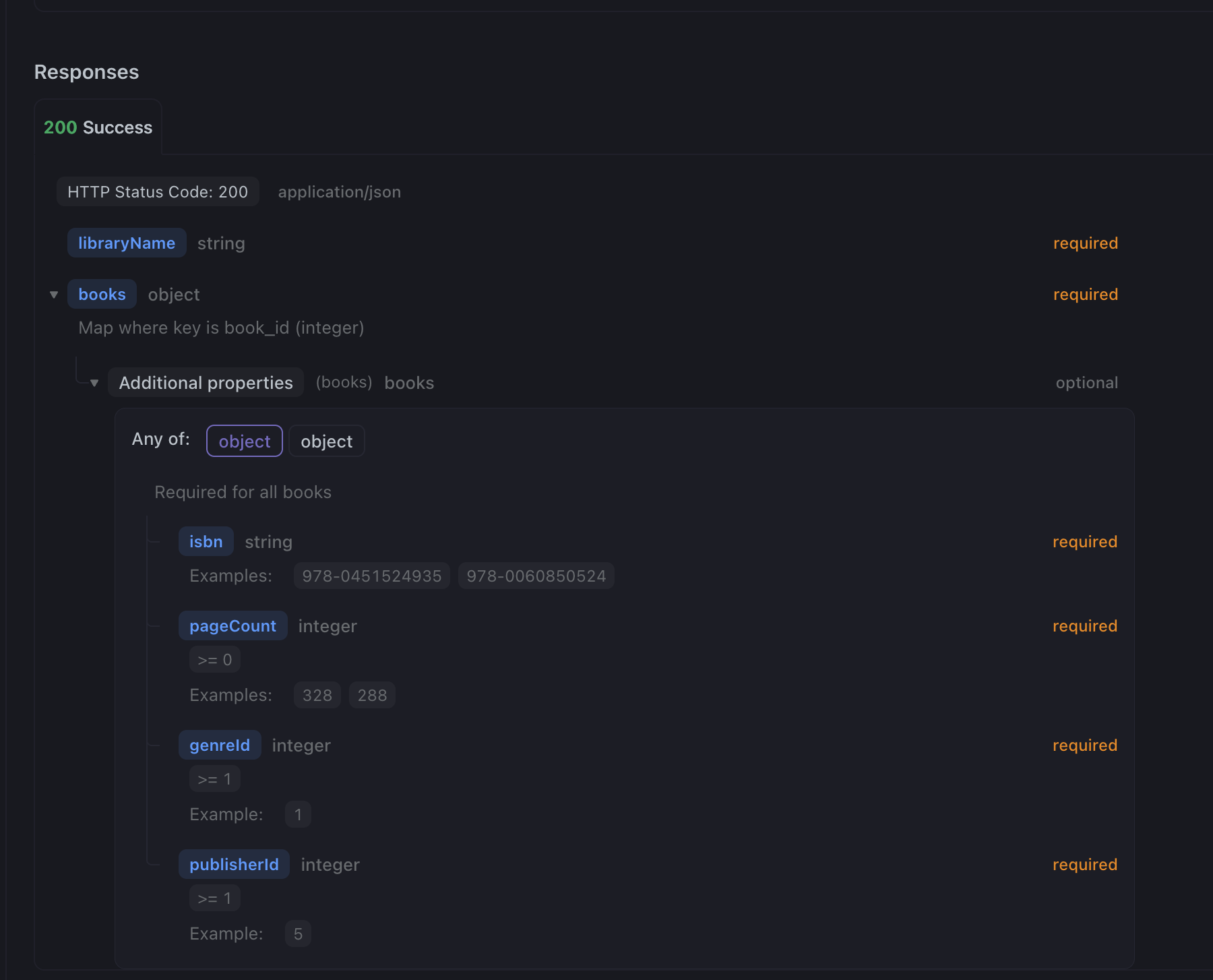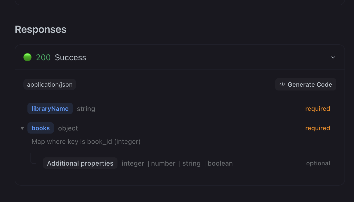 objectand setadditionalPropertiesas object with some fields - Share documentation with created endpoint (Publish docs → Shared Docs List → New)