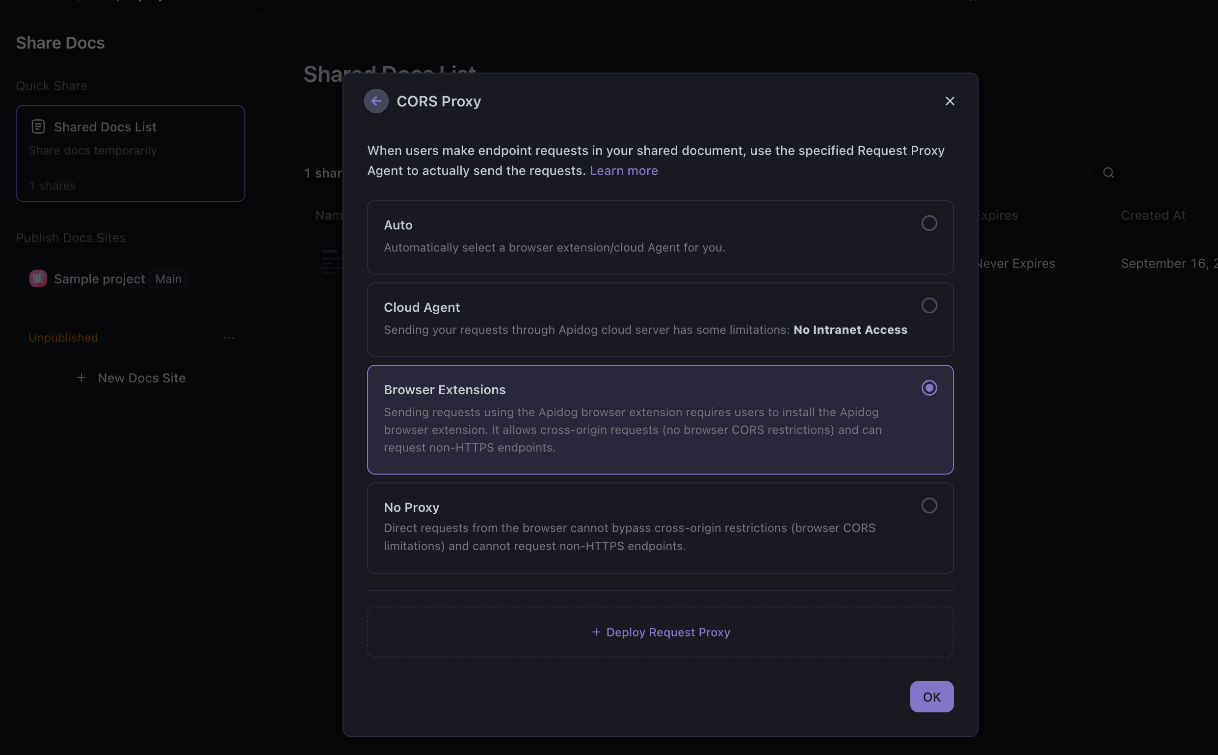 Currently, requests sent by the Apidog documentation site through Cloud Agent cannot automatically include cookies, which might be causing this issue. We will add support for this feature as soon as possible. For now, you can use the Browser Extensions as a CORS Proxy.