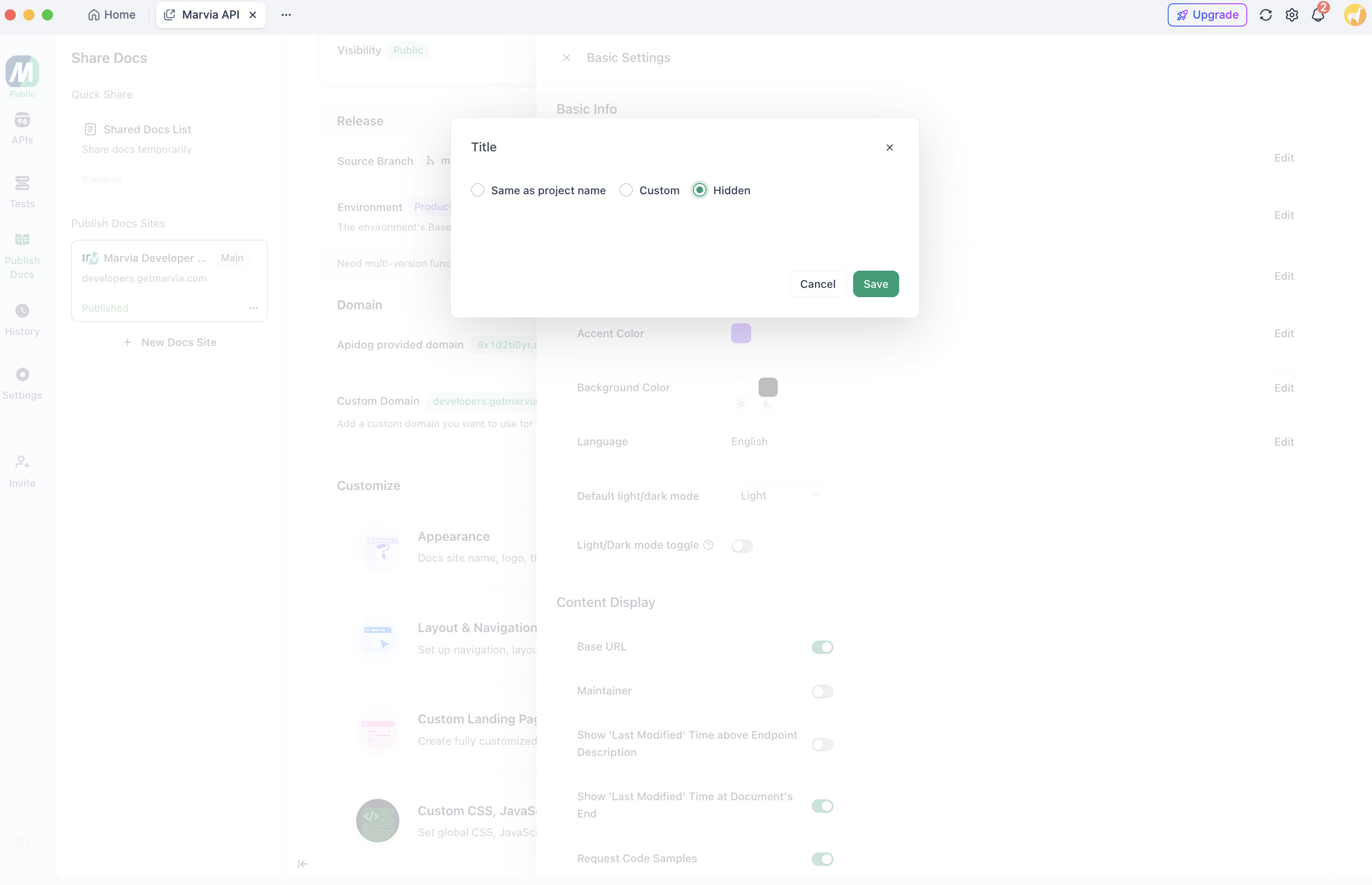 The main issue is, when I hide the title in the top navigation bar. (Next to the logo), then the Title shown on the Browser tab is changed to “API Dog - API Documentation”